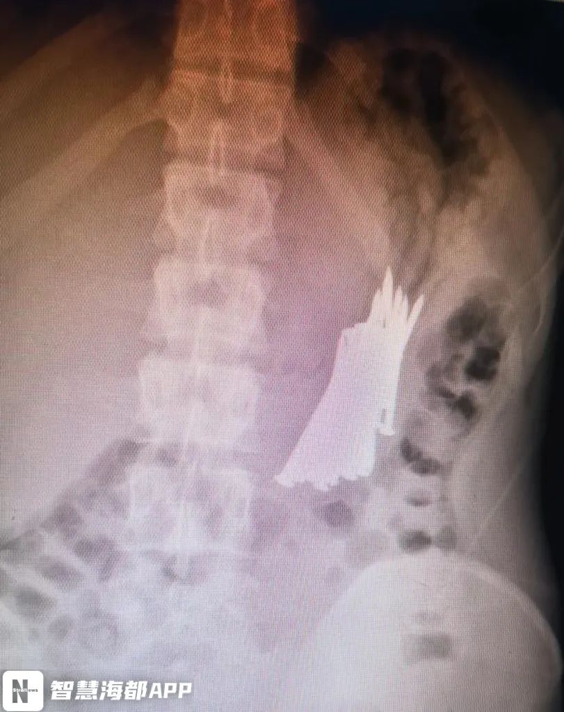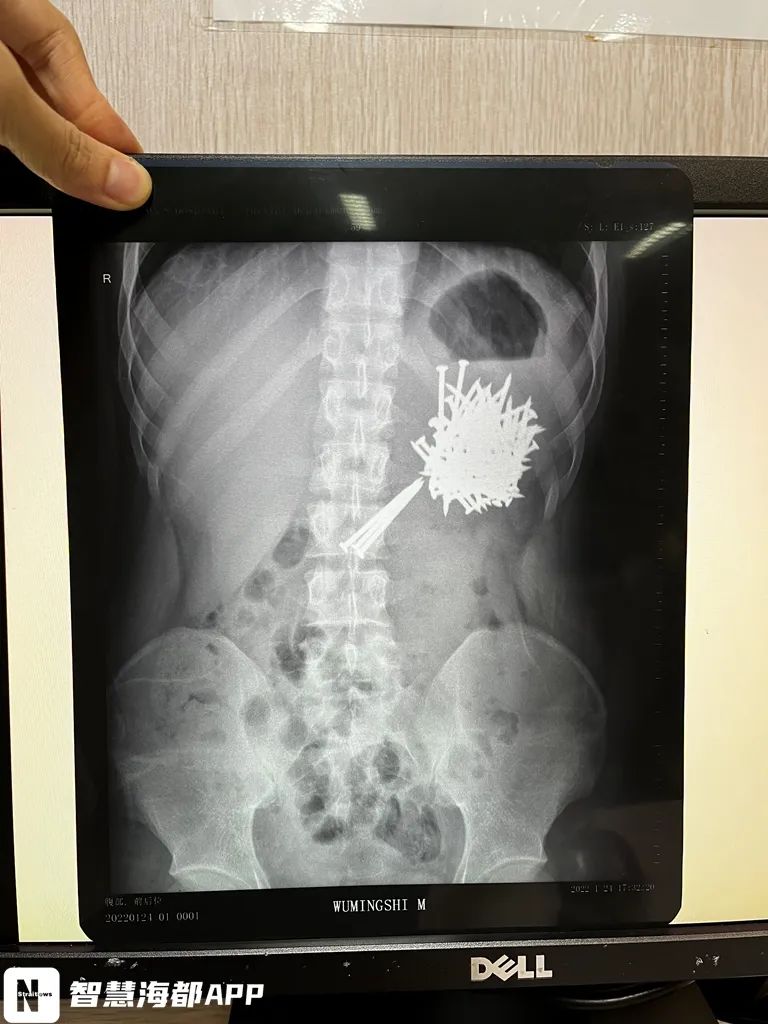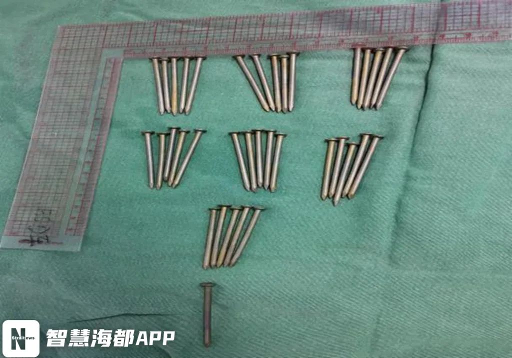 1月28日晚,21岁小伙丁丁(化名)吞下36根尖锐的铁钉,腹痛5小时后被民警紧急送往福建省第二人民医院救治。