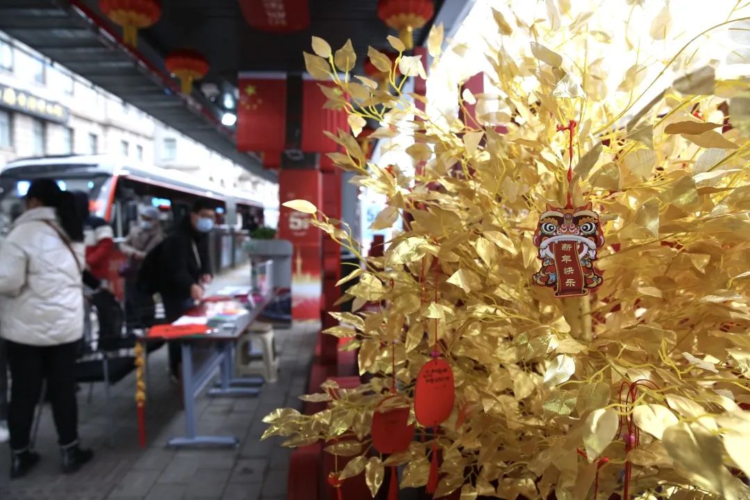 大红灯笼、五星红旗、金色许愿树、印有5周年字样的调度室外墙、红色祥云大拱门……中运量公交71路外滩站点焕然一新,让乘客感受到了浓浓的年味。