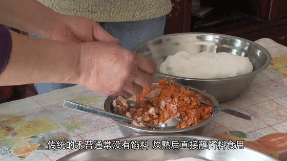 首先介绍的是禾苔。禾苔的制作简单,首先加热水将粘米粉揉搓成粉团,再用手将粉团搓为中间粗、两头细的粉条,然后炊熟制成。传统的禾苔通常没有馅料,炊熟后直接蘸酱料食用,也有人会在粉团里包入经过炒制的蔬菜肉馅。