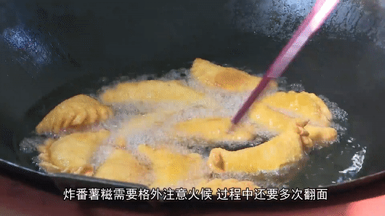 蒸熟的番薯与糯米粉混合揉成干湿适宜的面团,将小块面团搓圆按扁后,根据个人口味包入白糖花生、萝卜瘦肉等馅料,再将面团对折粘好,用螺旋状花纹封口。炸番薯糍需要格外注意火候,过程中还要多次翻面,以防表皮焦黑,炸至表面金黄即可捞出。