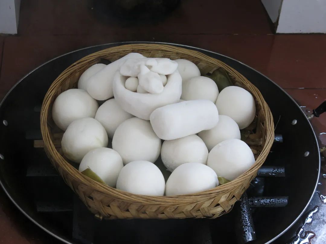 第四步是煮糍。把牛栏糍一个个码好,然后上锅用大火隔水炊熟。像这么大一篮的牛栏糍,必须要大火蒸煮一个多小时才能熟。这样,一道开平最地道的传统年糕:牛栏糍就完成了。蒸熟的牛栏糍,米香四溢,口感韧劲十足。