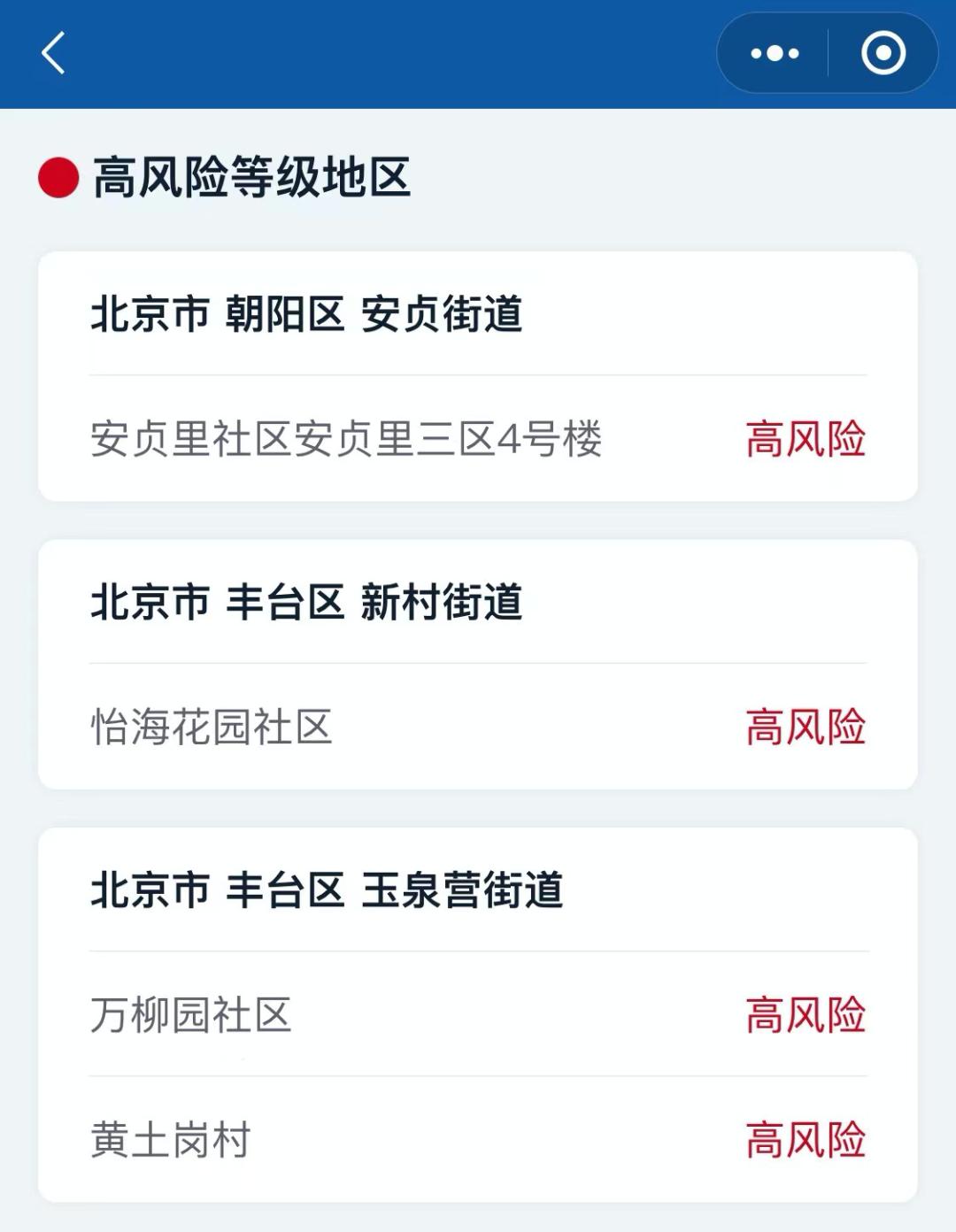 截至目前,北京有4个高风险地区,为丰台区玉泉营街道万柳园社区、新村街道怡海花园社区、玉泉营街道黄土岗村,朝阳区安贞街道安贞里三区4号楼。
