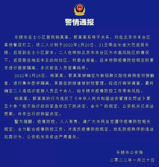 1月30日,山东乐陵市公安局发布警情通报:二人不按规定落实防疫要求,造成50余人成次密接,被警方行政拘留。
