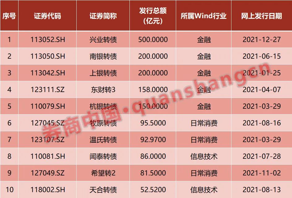 具体到单个企业,2021年,发行规模最大的单只转债为兴业银行的500亿元,紧随其后的南京银行和上海银行的200亿元,东方财富则发行了158亿元,杭州银行发行了150亿元。