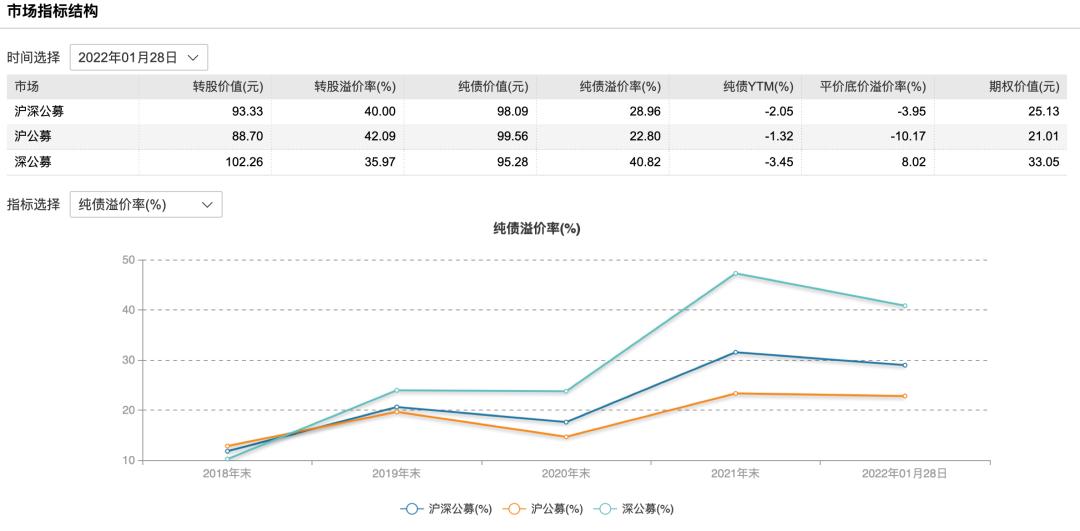 可转债的估值也来到了历史高位。wind数据显示,截至2021年年末,沪深公募转债整体的纯债溢价率为31.54%。2020年这一指标有所回调,到了2022年1月28日,已经涨到28.96%,但是也处于历史高位。