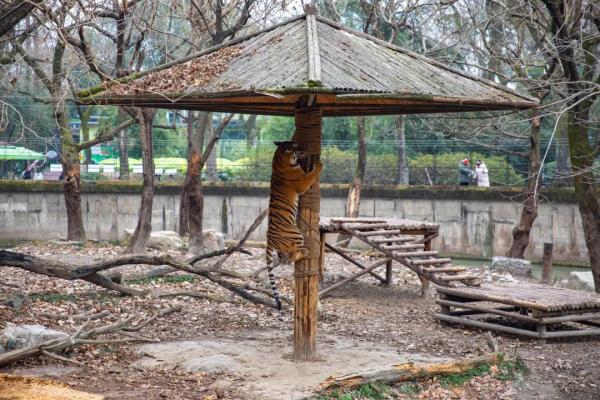 饲养员介绍,与传统投喂方式相比,“滑索取食”增加了老虎的取食难度和运动量,激发其自然野性,也得以让游客观赏到猛虎扑食的雄姿。同时,园方可以更生动直观地科普老虎捕食、跳跃力等知识。接下来,上海动物园会在其他猛兽展区,根据场地和动物情况,改造和推广“滑索取食”这样的新型喂食方式。