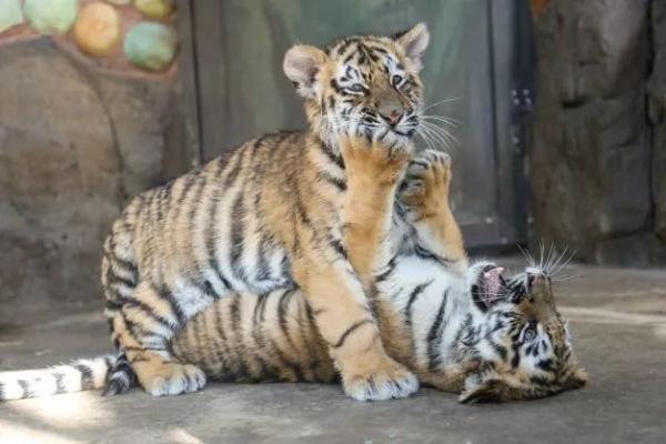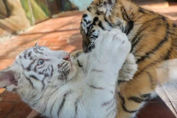 东北虎是对龙凤胎,“虎姐姐”胆大又心细,学习能力特别强,“虎弟弟”相对胆小安静。5天后,雌性的小白虎加入了姐弟俩生活圈,月龄相仿正好作伴。