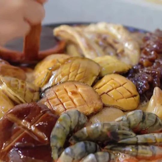 黑虎虾、鲮鱼滑、掌亦、花胶、鲍鱼、母鸡