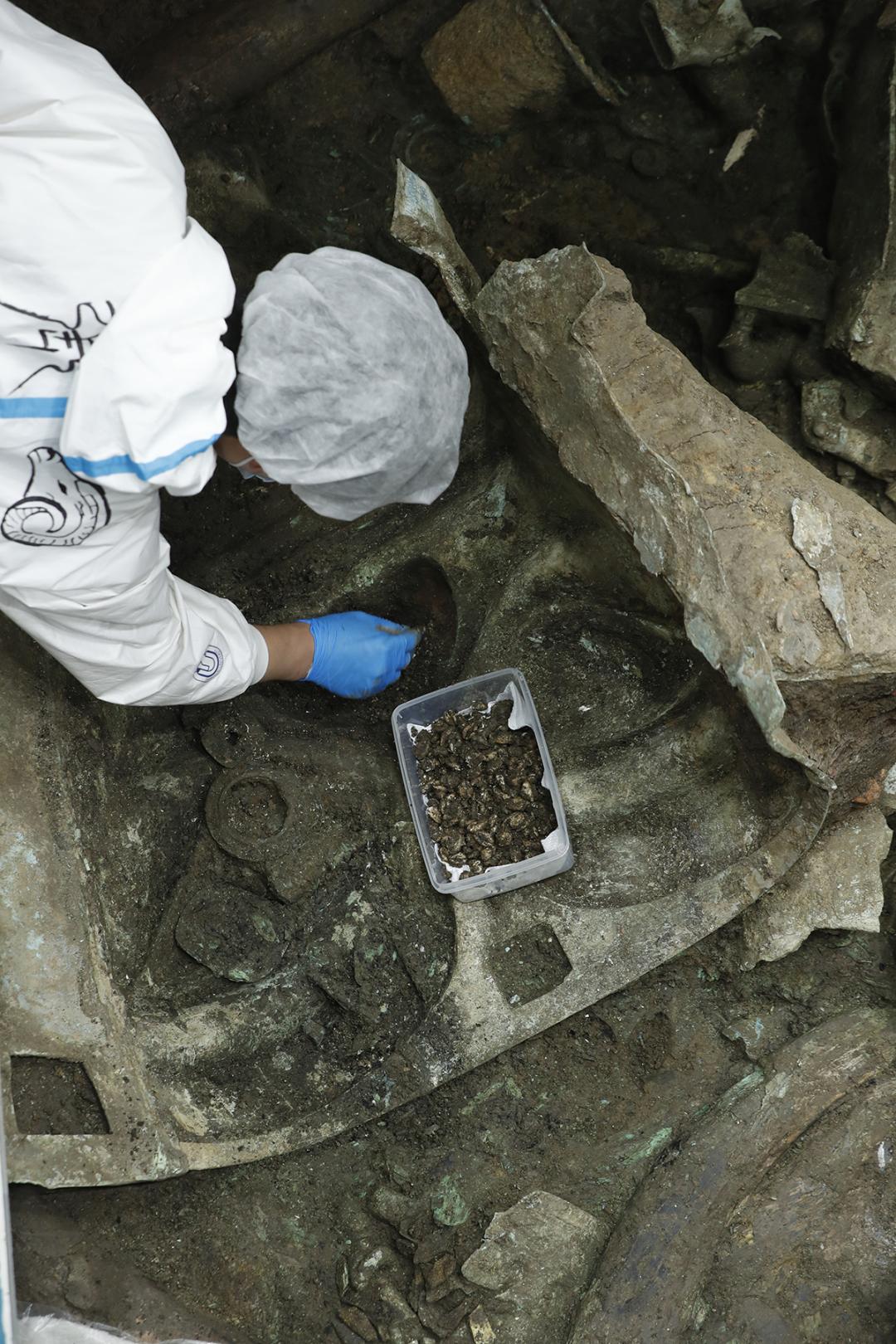 考古工作者正在清理鼻腔内的海贝