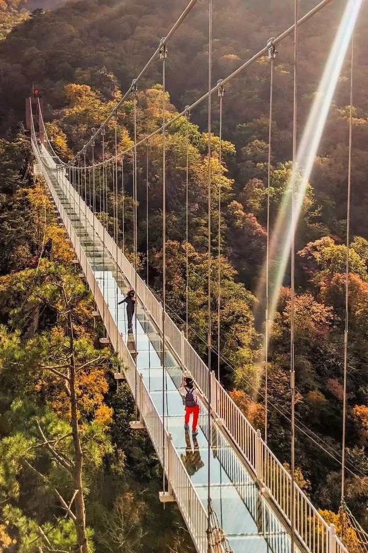 天桥沟近千公倾园地90%都被密林覆盖,形成群山环绕的森林浴场,这里的红叶秋景名不虚传。