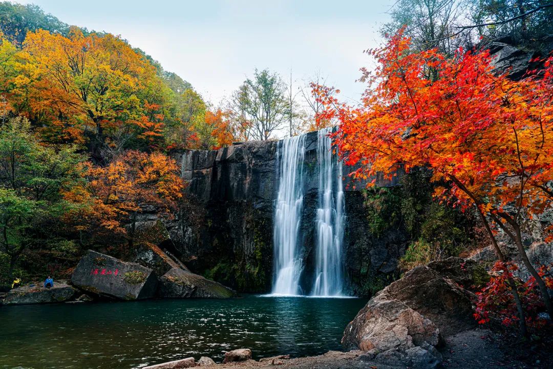 腾空而下的瀑布与红叶相互映衬,青山湖畔还有一条画家村,磅礴中又见幽雅,让人流连忘返。