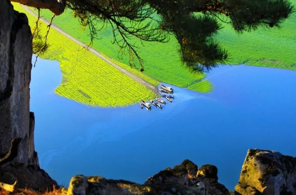 三千亩的油菜花相比于婺源来说要宏壮得多,层层涌动的黄色花浪令人如痴如醉,连动着江中倒映的蓝天白云,如油画般绚丽。