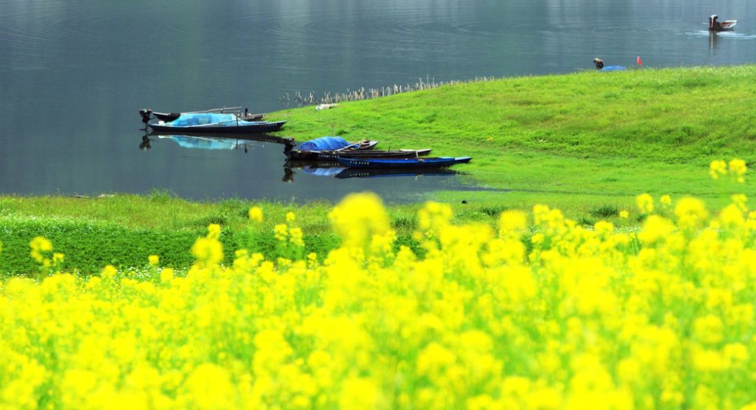 每年从5月下旬开始,绿江村就进入了最美的季节。滩地的低洼处稻田冒出了新芽,大片大片金黄的油菜花如约绽放,一直持续到6月下旬,端午小长假正是赏花时节。