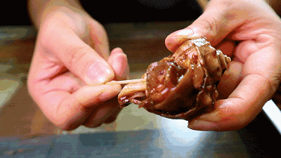 但到了丹东的夜市,也会有些让你吃到突破舒适圈的食物,丹东人喊的“神仙”,其实是柞蚕,这是蚕在还没吐丝成茧蛹的状态。
