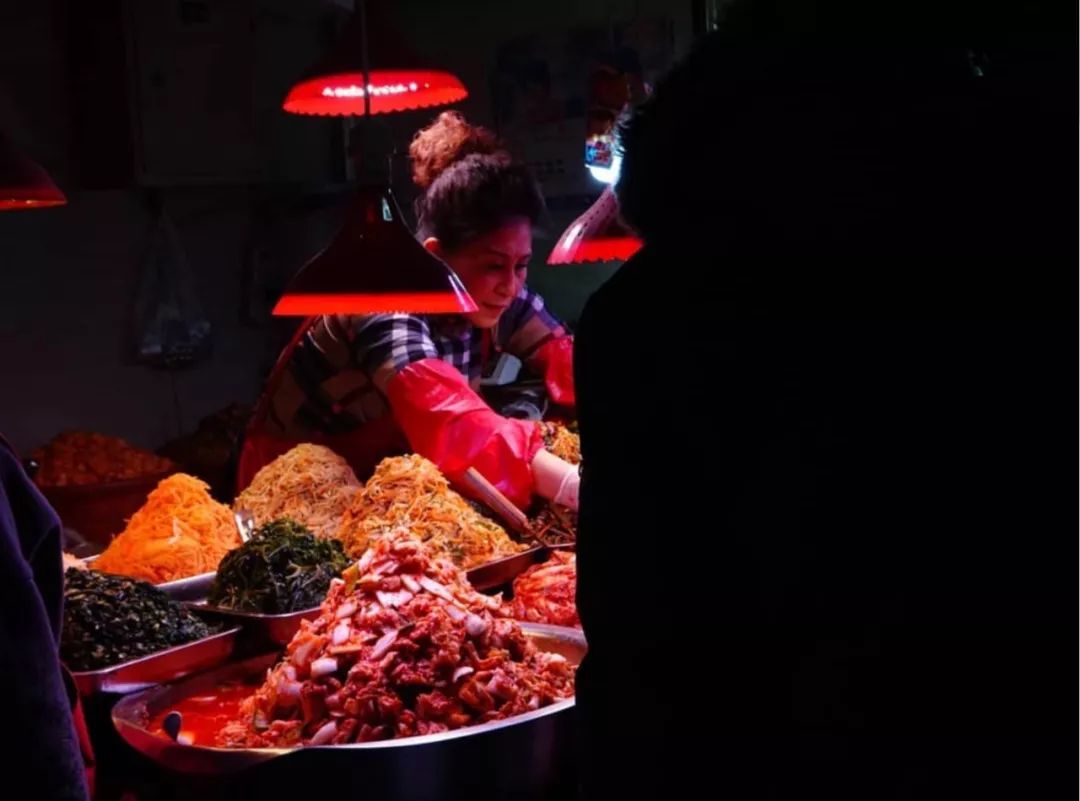 尤其到了高丽街,美食种类多到选择困难症都要犯了:盘肉、朝鲜米肠、打糕、参鸡汤、冷面、大酱汤…韩朝两国各类商品在丹东都能买到,泡菜摊成了丹东市场的日常景色。