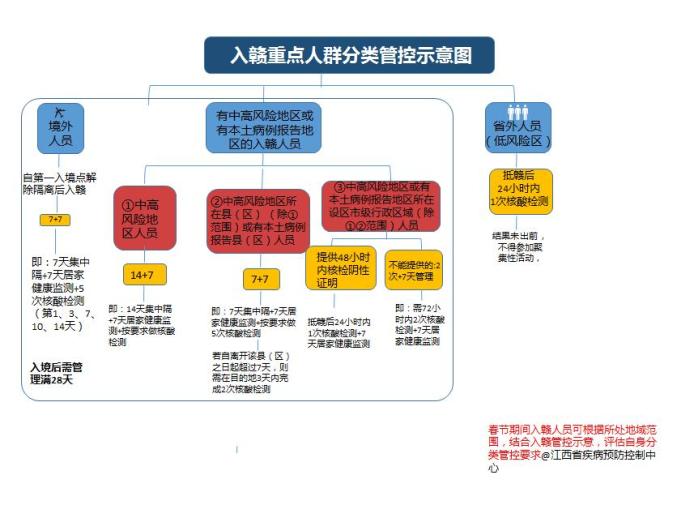 四、当前,疫情防控形势依然严峻,坚持非必需不出境,不前往中高风险地区和有阳性检测者报告的地区。外出时应保持高度警惕,严格做好个人防护,省外来(返)赣到达属地后须主动向所在社区(村组)、单位报告,24小时内主动进行核酸检测,抵赣14天内做好个人健康监测,一旦出现发热、干咳、乏力、咽痛、嗅(味)觉减退、腹泻等症状,在做好个人防护前提下,及时就近到发热门诊就诊,并主动告知近期旅居史和相关人员接触史,不建议自行购买药物服用。14天内避免参加聚集聚餐活动,避免前往人员密集、人流量大、空间密闭的场所。群众出行请规范佩戴口罩,保持安全距离,平平安安过大年。
