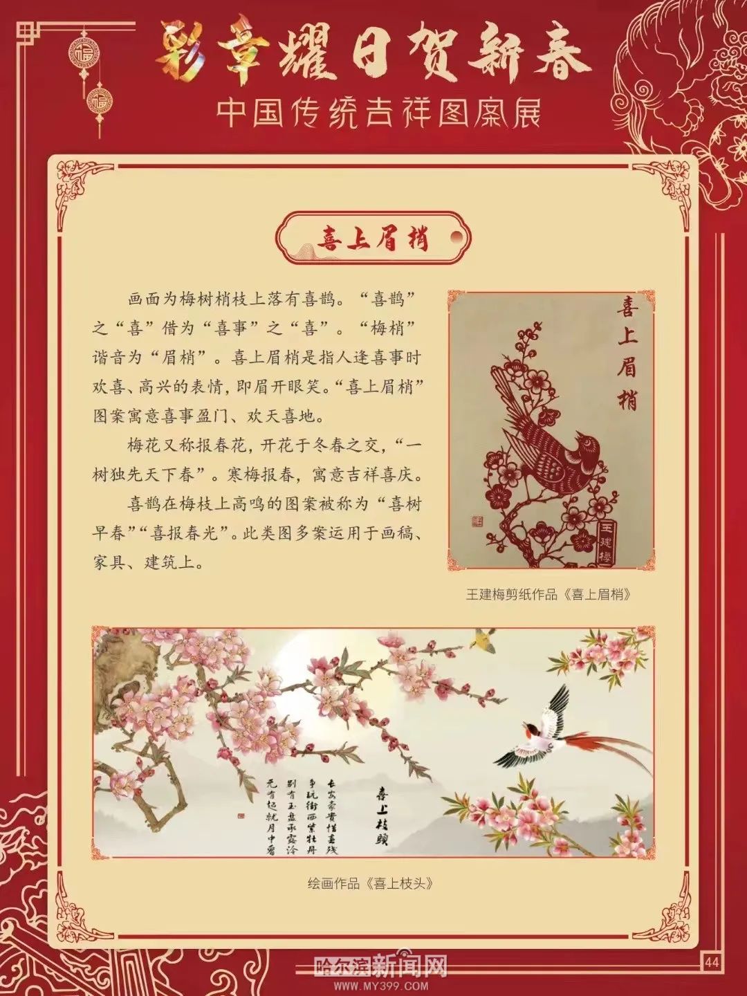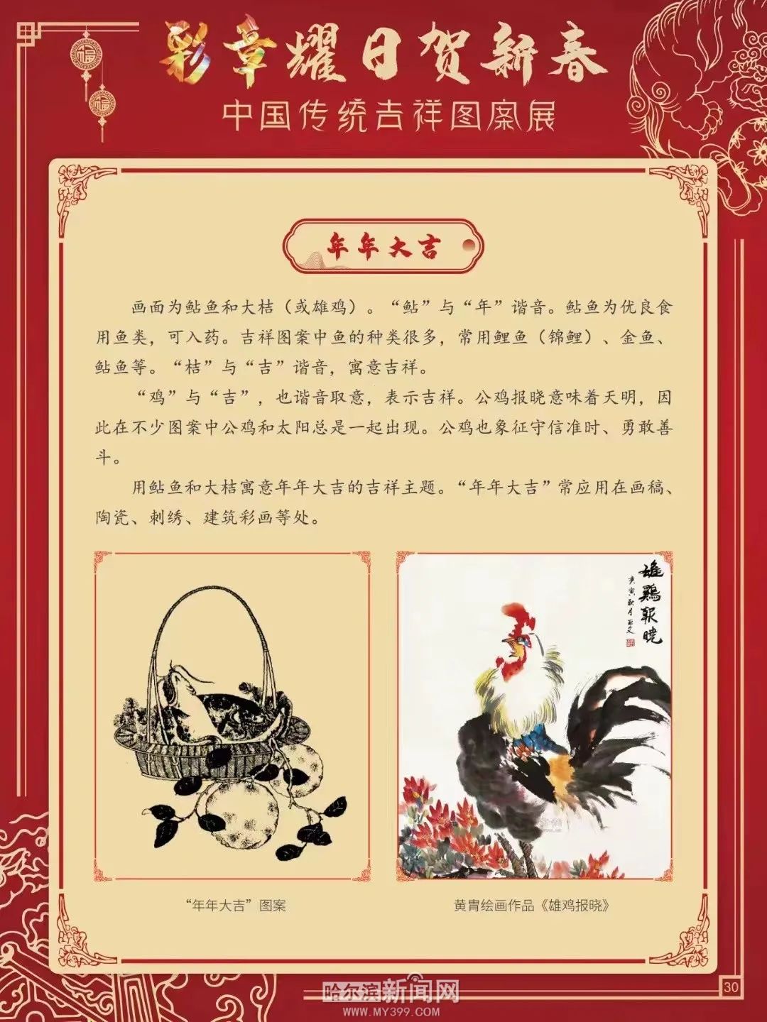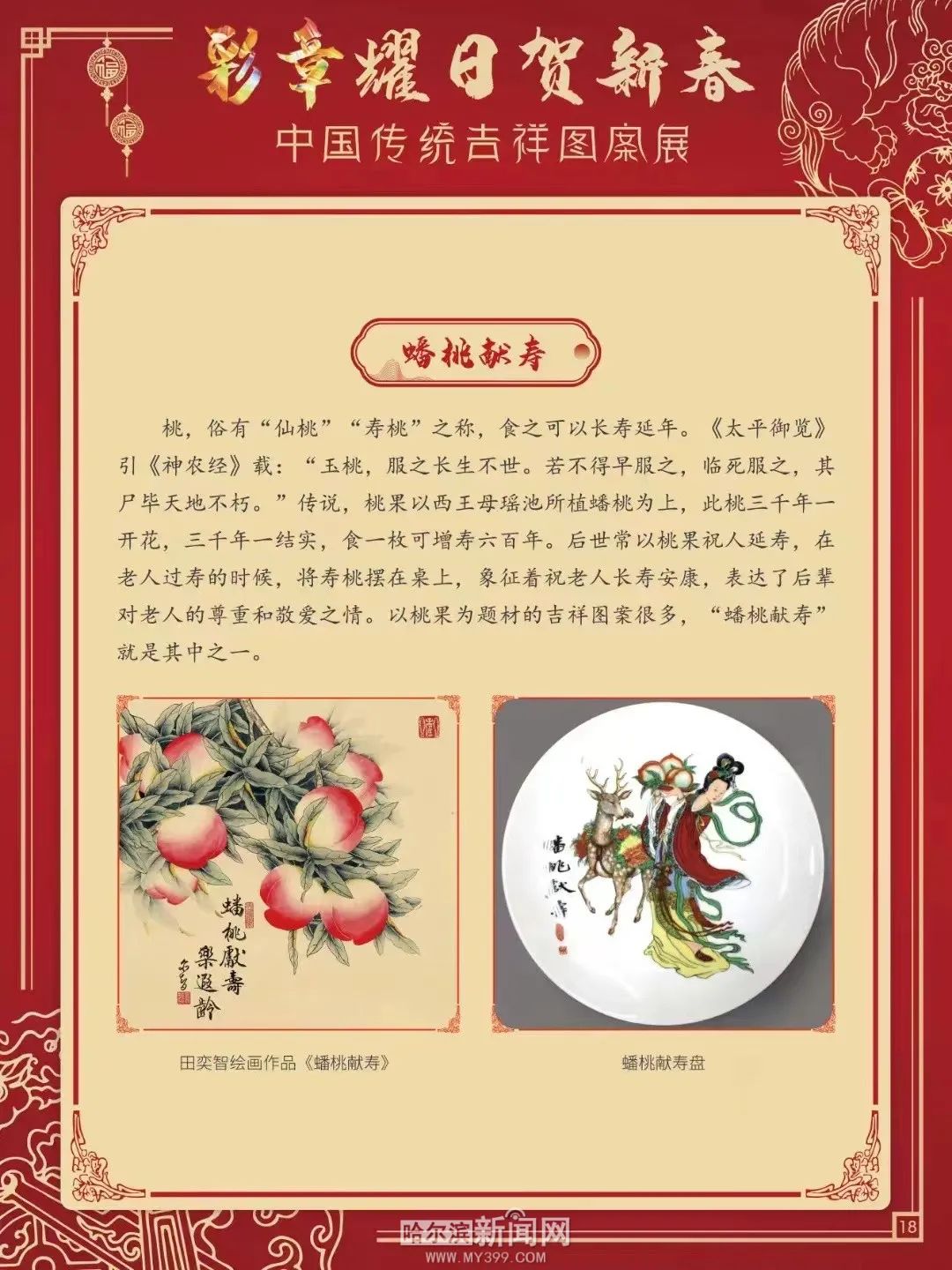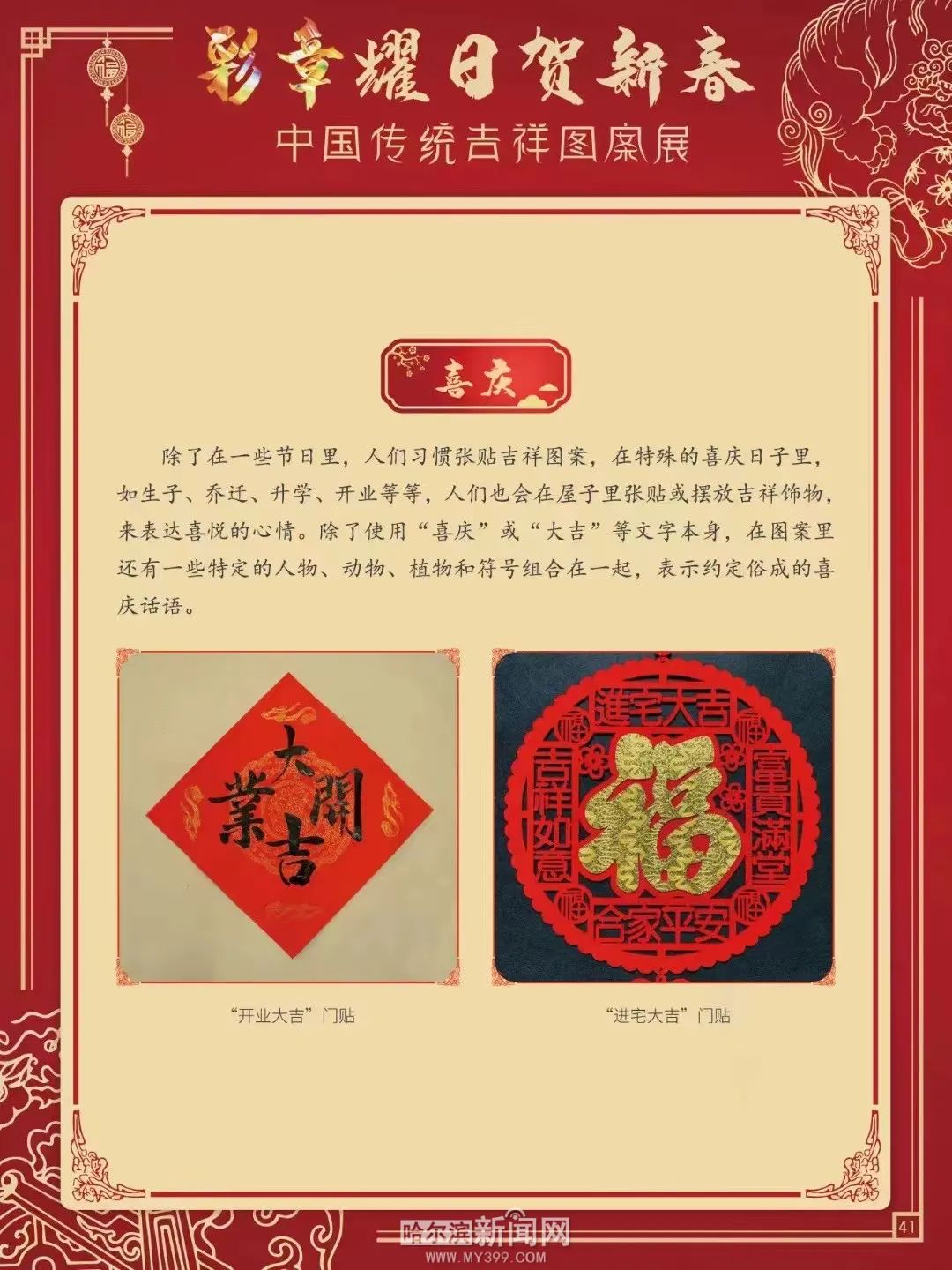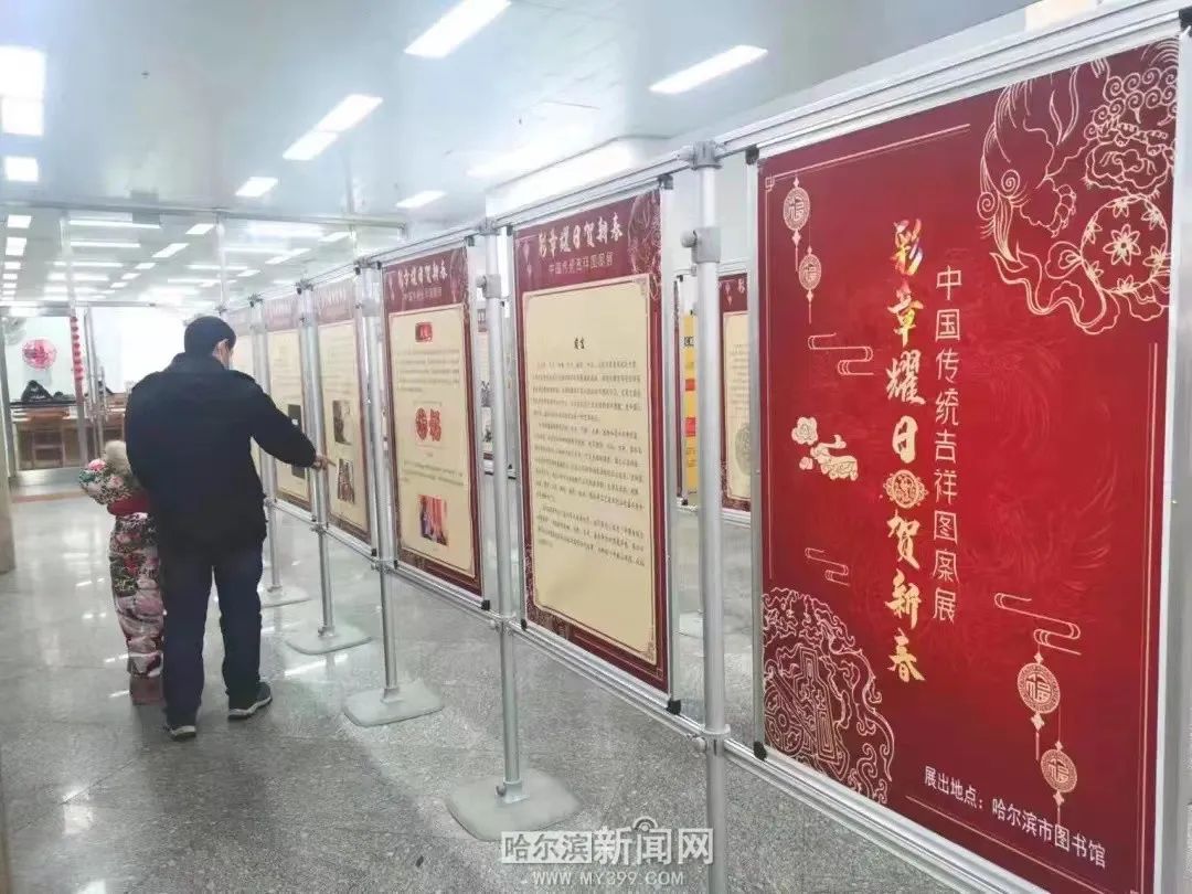辞旧迎新虎年到。日前,哈尔滨市图书馆在一楼展厅举办“彩章耀日贺新春——中国传统吉祥图案展”,展出内容按照鸿福、长寿、吉祥、喜庆等吉祥寓意分类,展示中国传统吉祥图案的符号构成及其背后的故事。
