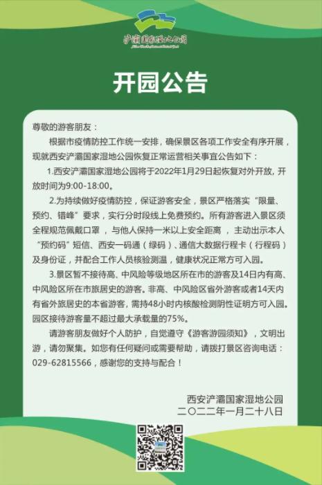 浐灞国家湿地公园1月28日发布公告,2022年1月29日起恢复开园。