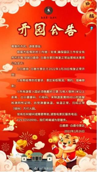 1月24日,白鹿原影视城发布公告,将于2月1日12:00正式恢复开园。