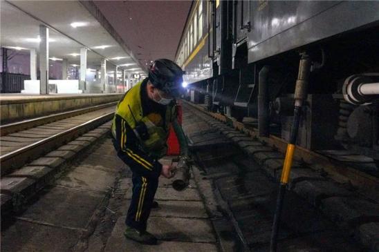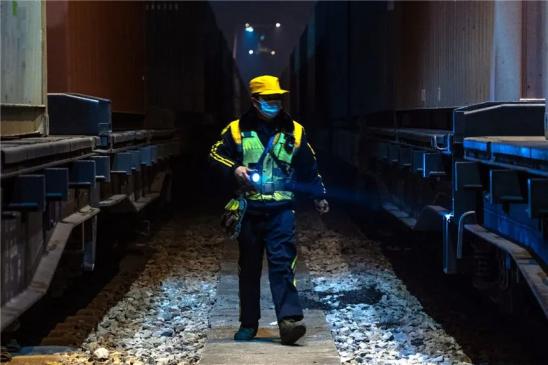 汉西车务段吴家山站调车长张鹏飞正在检查车辆,确保货物列车开行安全,这是张鹏飞连续在岗位上的第4个春节。肖一鸣摄
