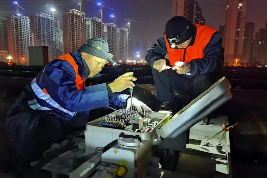 信阳电务段驻马店西客专电务车间刘国强、贾政正在对驻马店西站道岔进行现场检修,确保设备运行安全。孟文性、张涛涛摄