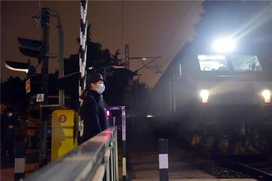 武汉桥工段道口工张月曦正在井岗一道口立岗接车,确保道口行车安全。这是张月曦连续在岗位上的第三个春节。陈强摄