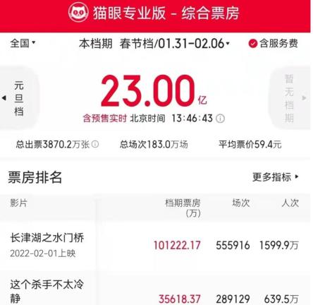 数据显示,2022年2月2日13时46分,2022年春节档总票房(含预售)破23亿。其中,电影《长津湖之水门桥》票房超过10亿元,领跑春节档。
