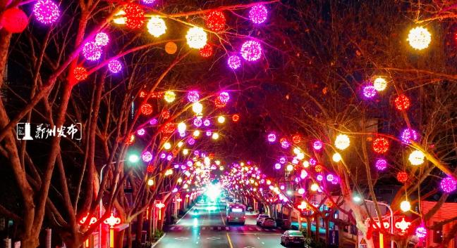 4)春节期间,郑州市多条道路挂上了大红灯笼和各式彩灯,节日气氛浓郁。今年彩灯悬挂本着节约的原则,以去年拆除的旧灯为“主力军”,补充部分新灯,达到设计效果。