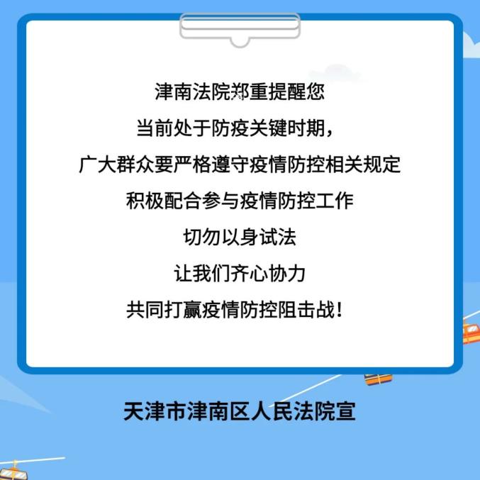 2日,津南区人民法院发布了两种不配合疫情防控的违法违规情形以及承担的相应法律后果,并公布了5个典型案例,其中,有两个案例发生在津南区。