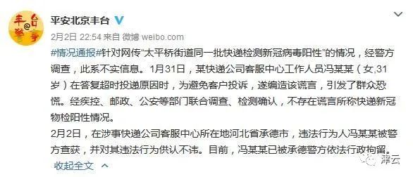 据北京丰台公安分局官方微博消息,针对网上流传“太平桥街道同一批快递检测新冠病毒阳性”的情况,经警方调查,此系不实信息。1月31日,某快递公司客服中心工作人员冯某某(女,31岁)在答复超时投递原因时,为避免客户投诉,遂编造该谎言,引发了群众恐慌。经疾控、邮政、公安等部门联合调查、检测确认,不存在谎言所称快递新冠物检阳性情况。