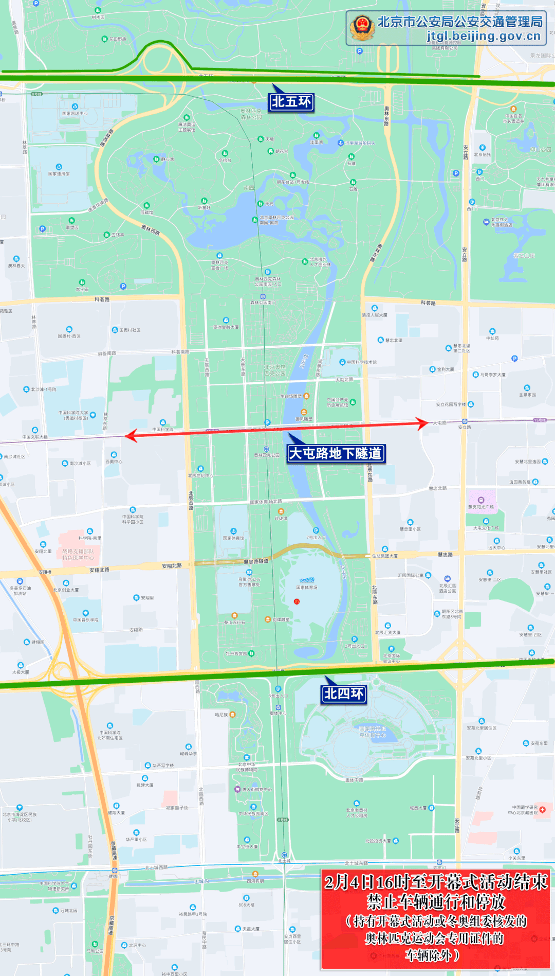 一、6时至开幕式活动结束,慧忠路地下隧道、国家体育场北路、大屯路(不含大屯路地下隧道)、大屯北路、科荟南路、北五环路南侧辅路(奥林西桥至奥林东桥)、天辰西路、景观大道、天辰东路、湖景西路、湖景东路、奥林东路北向南方向主辅路、北辰东路北向南方向主辅路、北辰路南向北方向主辅路(民族园路至北辰桥),除持有开幕式活动或冬奥组委核发的奥林匹克运动会专用证件的车辆和人员外,禁止其他车辆和行人通行。社会车辆和公交车可经大屯路地下隧道、北四环路、北五环路主路及北侧辅路、北土城西路、北土城东路绕行。
