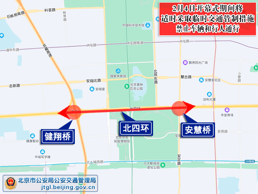 五、开幕式期间,将适时对北四环主辅路(健翔桥至安慧桥)采取临时交通管制措施,禁止车辆及行人通行。