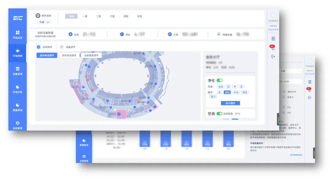 国家体育场(鸟巢)和国家速滑馆首次全面布设健康环境系统。在常态化疫情防控背景下,针对重大赛事活动与日常运营管理和安全组织需求,构建“平疫结合”的环境监测与保障系统,实现“环境感知—风险识别—综合治理”的闭环管理,以及“空气品质—光环境—热舒适环境”的多维环境精细化调控,为公众提供健康、安全、舒适的环境品质体验。同时通过与安防、能源系统的数据共享,实现基于客流密度的能源环境双高效运行,在保证环境效果的同时引导低碳可持续发展,全面提升赛时管理及赛后运营效率。