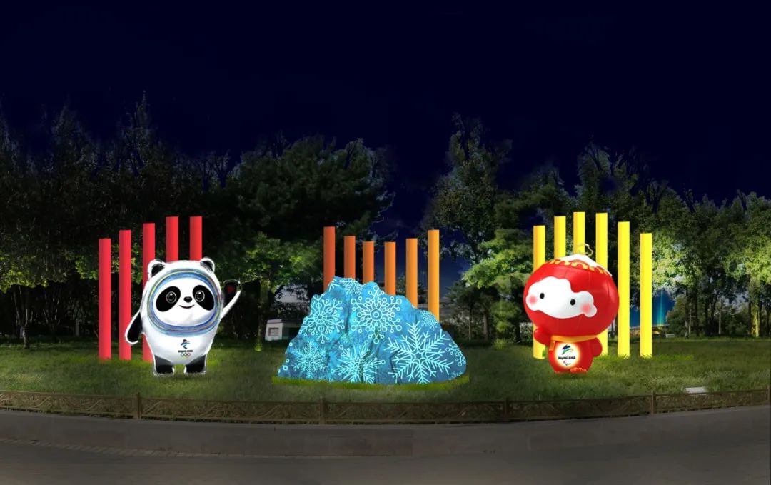 冬奥元素+风景长卷:根据奥组委的统一布置指导要求,将冬奥及残奥吉祥物”冰敦敦、雪容融”与冬奥及冬残奥会徽、图鉴相融合,建筑节点式观景和行进时体验,在沿线的绿化带内形成组景式、长卷式的连续景观,展示一幅冰雪迎奥运的热情画卷,营造冬奥和新年气氛。