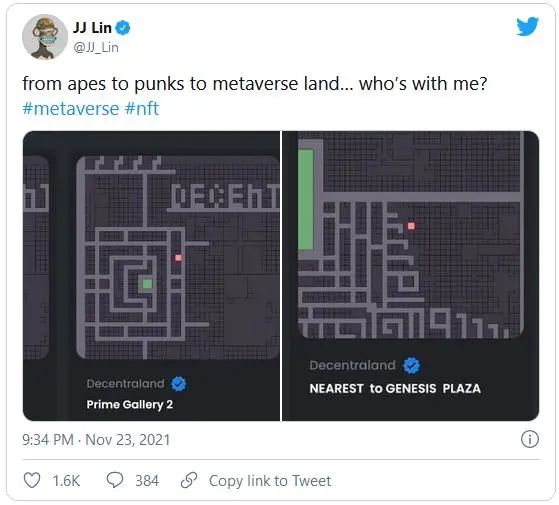 关注到元宇宙这个概念最初是源于林俊杰,我是JJ的老粉,从小听他歌长大,那天看到新闻说他在Decentraland平台上花了12.3万美元买了3块虚拟土地,由此吸引了我的注意。