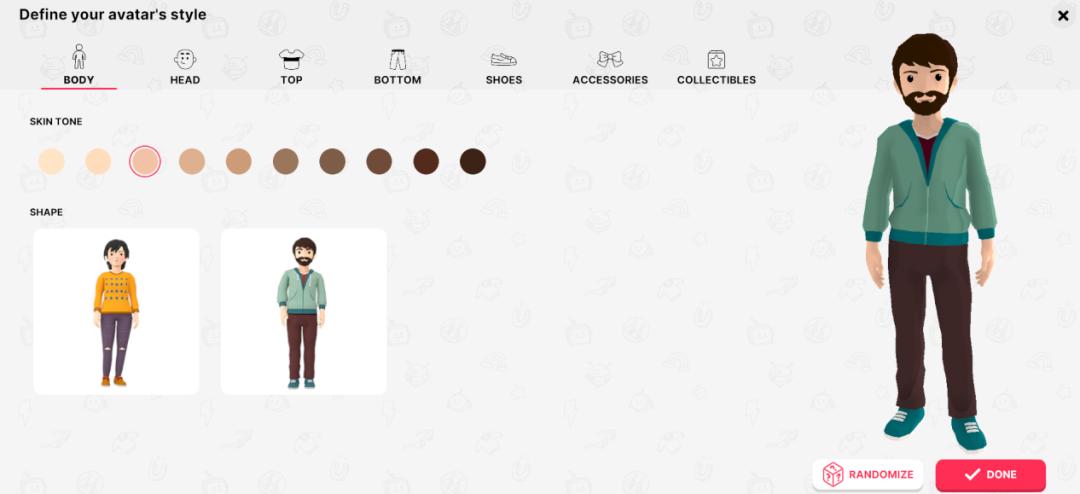 我点开Decentraland游戏,映入眼帘的是游戏捏脸,对于一个新用户来讲需要先有一个角色,包括性别、发型、服饰,其中有一个配饰需要额外花费1MANA购买(MANA为Decentraland区块链代币),不过不购买也可以进入游戏。