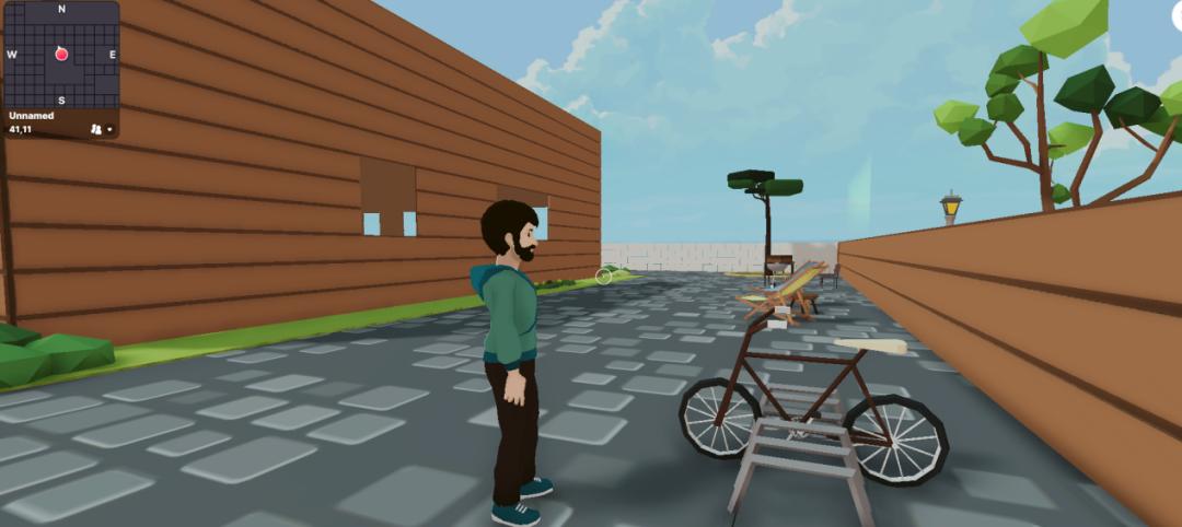 在创建身份后便进入了Decentraland游戏,点击林俊杰周边的土地后,我发现自己站在临近游戏创世纪广场的一栋别墅里,别墅院子停着车主的自行车,躺椅等设施。