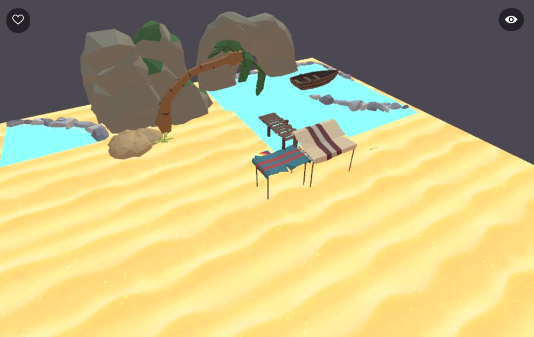 在这款游戏可以购买土地,购买后可以用游戏中的各种素材在土地上建造东西,比如这名体验者就建了一片海滩。