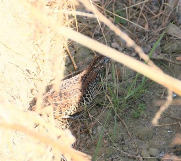 和浙江常见的鹌鹑(Coturnix japonica)相比,该鸟体羽有更多夹杂黑色和皮黄色的斑纹,喙、跗跖、脚趾都是蓝灰色,经鉴定是一只棕三趾鹑,是2021年发现的第一个浙江省鸟类新记录。棕三趾鹑分布于我国东南、华南和西南地区,最靠近浙江省的分布地为福建东北部,本次记录拓展了其在东部地区分布的北限。