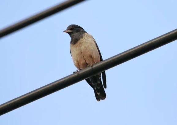 该鸟为浙江省鸟类新记录,也是杭州市鸟类新记录。粉红椋鸟是一种体色靓丽的鸣禽,分布于我国西北地区,冬季在华东地区亦有少量的迷鸟记录,上海、福建等地都有零星记录。这只粉红椋鸟混群于本地土著丝光椋鸟(Spodiopsar sericeus)和灰椋鸟(Spodiopsar cineraceus)之中,但其黑色的头、颈部和粉赭色的胸、腹部都表明了它与众不同的身份。