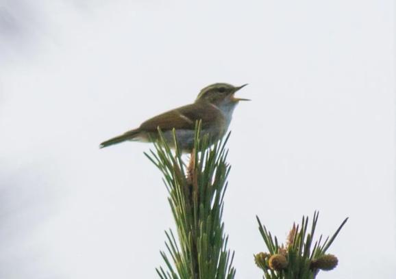 该鸟体型较当地常见的华南冠纹柳莺(Phylloscopus goodsoni)略小,背部呈橄榄绿色,腹部呈灰白色,眉纹淡黄色,具一道清晰的翼斑。被发现时,该鸟站在松树顶上持续发出鸣唱,鸣声为单调重复的双音节。经过对比鉴定,确认该鸟是云南柳莺,为浙江省鸟类新记录。