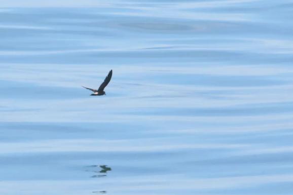 该鸟体型较小,体羽为黑褐色,具显著的“白腰”特征——腰部至尾上覆羽白色较宽、“白腰”的中部断开(有黑色羽毛分隔),尾羽中央内凹,脚趾不伸出尾羽末端。结合体型、分布等信息综合判断,该鸟符合白腰叉尾海燕的特征,为浙江省鸟类新记录。白腰叉尾海燕广泛分布于太平洋和大西洋,但通常活动于外海,极少靠近内陆,在我国甚罕见,仅台湾、黑龙江有零星记录。
