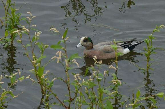 该鸟与雄性赤颈鸭相似,但体型稍大,额头近白色,眉纹呈墨绿色,前胸至两胁粉褐色,尾羽较长而尖,翼下覆羽白色,经鉴定,为绿眉鸭雄鸟。