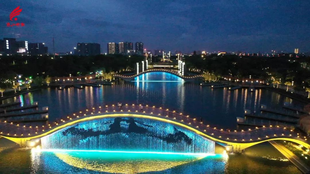 三孔桥下的数字水帘,呈现了不同形状、色彩的景观,让人惊艳。