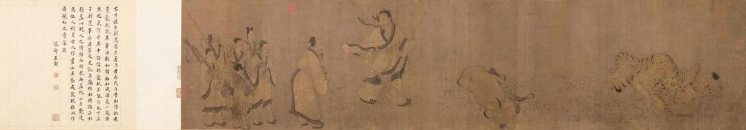 上图是宋人画卞庄子刺虎图,这件从宋代遗存下来的古画无名款,清宫归于宋代李公麟名下。卞庄子是春秋时期鲁国著名的勇士。《史记·张仪列传》曾记载卞庄子刺虎一事,讲卞庄子要去刺杀老虎,旅馆童仆制止他并说,这两只老虎正在吃一头牛,吃得有滋有味的时候必会争斗,争斗后大虎受伤、小虎死亡,你再去刺杀受伤的老虎,一下子就会得到杀掉了双虎的名声。卞庄子认为这番话有道理,便默默等待,果然不一会儿二虎相争,一死一伤,卞庄子刺杀伤虎,一举便得双虎之功。