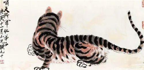 同样角度的虎画还有齐白石的虎,在他寥寥的虎元素作品里,几乎都是老虎的屁股,似乎也是借鉴了高其佩的“背虎”画法,其笔下的老虎更似大猫,画风独树一帜。