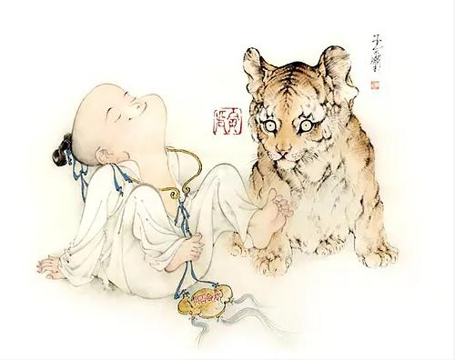 这是早年师从刘继卣的一代国画大家——谢玉玺的画作。图中一位孩童坐在地上,旁边一头小虎相伴。孩童头扎发髻,身挂长命锁,怡然自乐颇具情趣,旁边坐卧一只小虎,小虎慈目圆睁,可爱乖巧,就像一只小猫。作者笔下的老虎虽没有野生老虎的虎气,却栩栩如生,与俏皮可爱的孩童相映成趣,自成一家之风也。