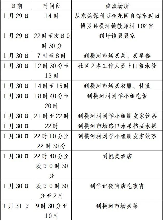 1月29日:18时30分左右在深圳市宝安区石岩街道罗租社区艾美特科技园附近(工作单位)搭乘顺风车返回揭西过年。19时40分左右到达惠州沥林服务区休息(如厕、加油)。22时04分左右到达揭西县五云镇换乘顺风车,于22时30分左右回到揭西县五云镇赤告村家中,未外出。