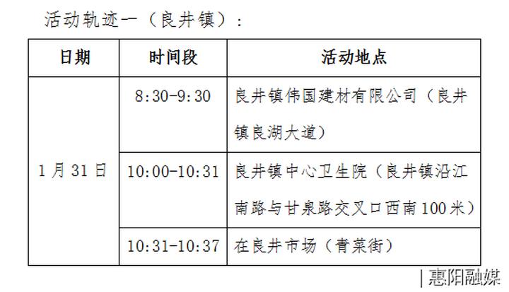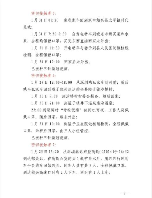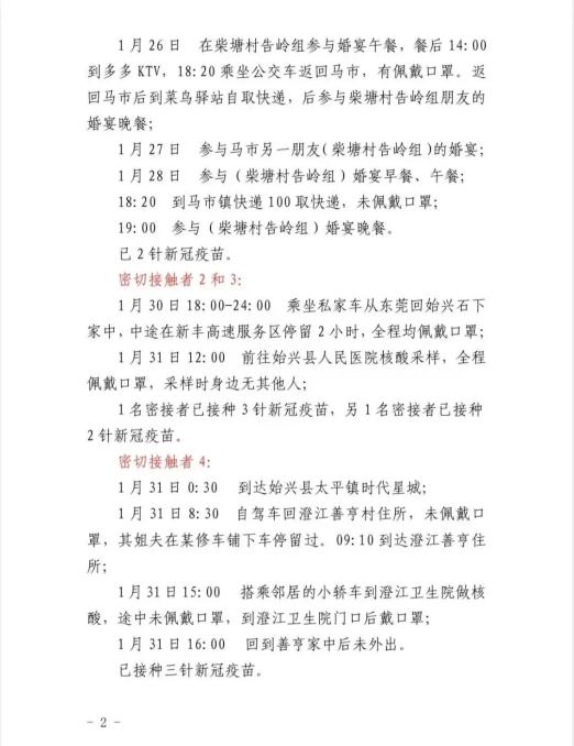 1月31日:1时左右回到揭西县灰寨镇南洋村灰寨镇家中,10时左右到同村小叔家,10时30分左右到金和镇枫山园村亲友家,11时30分左右返家。之后行程同密接2一致。
