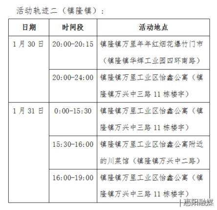 1月30日:15时40分左右到河婆街道福家欣超市购物,全程佩戴口罩,其余时间居家。